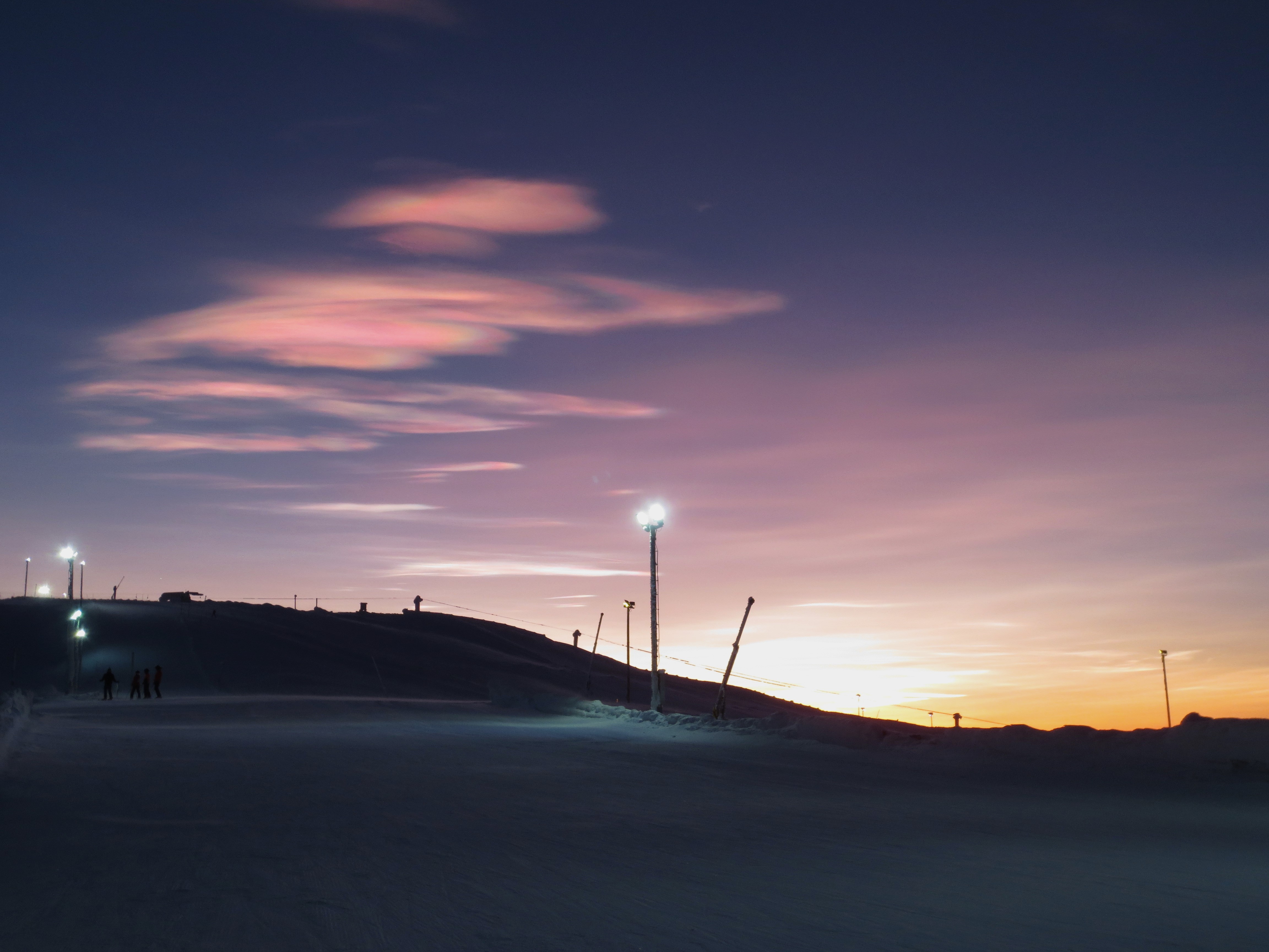 4 Pakkasyön pimeys alkaa laskeutua tunturin ylle samalla kun auringon viimeiset säteet värjäävät maisemaa. Rinteet hiljenevät, ja mekin päätämme alkaa tehdä lähtöä. Laskemme loivaa alamäkeä kohti viimeisiä rinteitä, kun mutkan takaa paljastuu oranssinpunaivsena hehkuva taivas. Taakse vilkaistessa katse jumittuu vaaleanpunaisiksi värjäytyneisiin pilviin. Pysähdymme, ja kaivamme kamerat esiin.